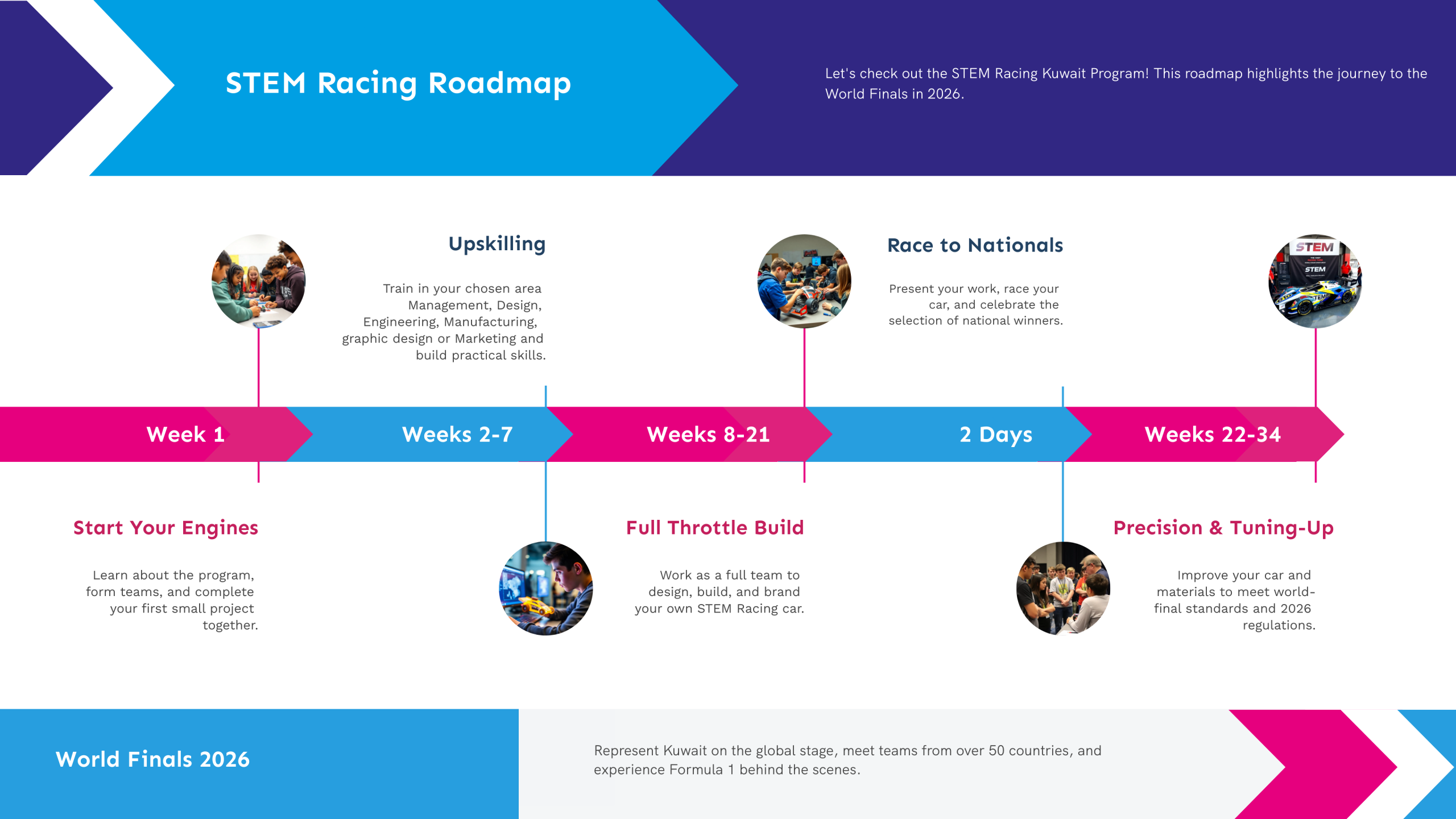 The STEM Racing Excellence Program aims to empower Kuwaiti high school students through practical, team-based STEM learning inspired by Formula 1 engineering. Participants will: